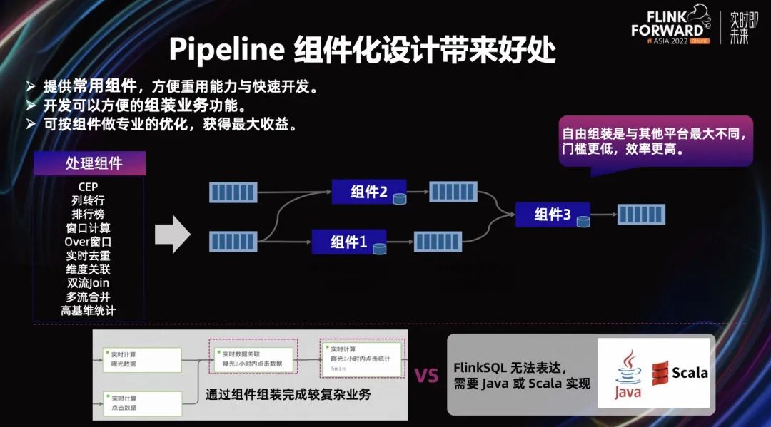 开发可以方便的组装业务功能,它可以自由进行上下有连接。同时,我们也可以按组件做专业的优化,获得最大收益。自由组装的方式与其他平台的方式可能会由一些不同,比如 Flink 有一个 Interval Join 之后,它的 Watermark 会产生一个 delay,delay 的时间取决于 Interval Join 等待的时间。这样的场景,如果要经过一个 Interval Join 后,下游再做一个窗口计算,下一个的窗口的触发时间就会延迟。