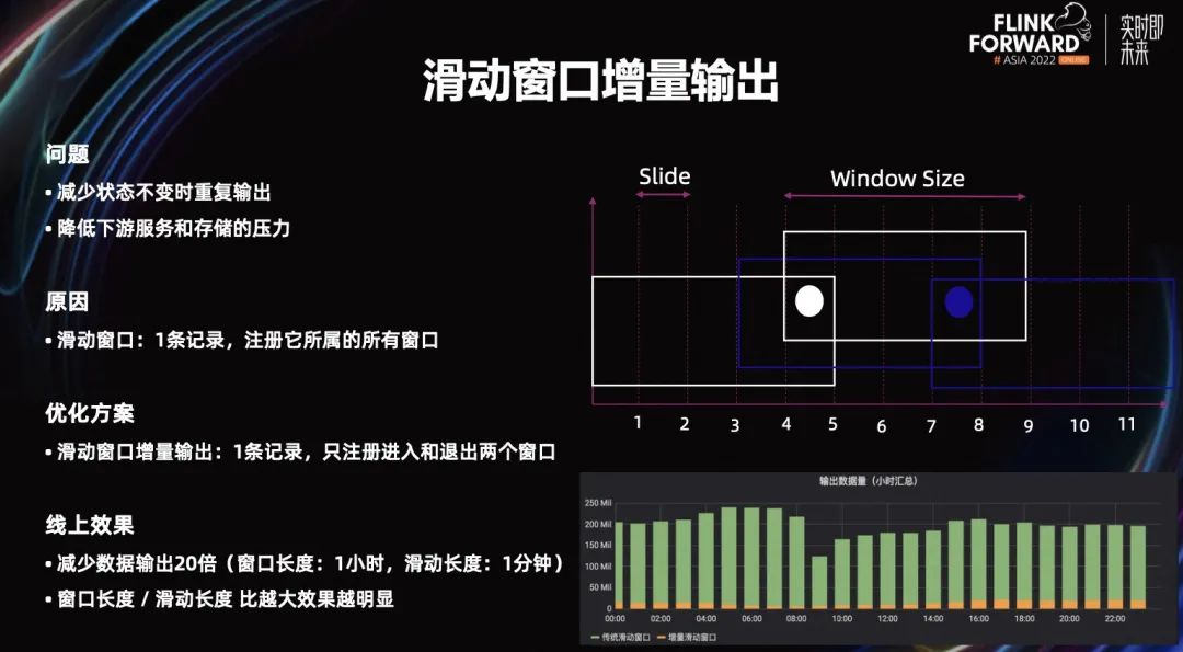 为了这个解决问题,我们做了一个滑动窗口增量输出的窗口,即一条记录过来,只注册这条记录进入和退出的两个窗口,其他窗口都不注册,这样就可以大大减少我们的输出,常常可达到减少 20 倍左右。