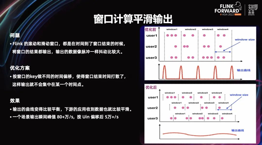 为此我们做了一个平滑窗口,即按照窗口 key 的不同做时间偏移,使窗口的结束时间是打散的,这样输出就不会集中到某个时间点。比如用户 1 的窗口时间是 0~10,用户 2 就是 1~11,用户 3 就是 2~12,这样的话每个用户的窗口结束时间都不一样,输出就会比较平滑,但它的窗口长度是一样的。因为在风控里对窗口长度要求比较严格,对窗口开始时间要求不是那么严格,这就能很好的解决业务场景的问题。