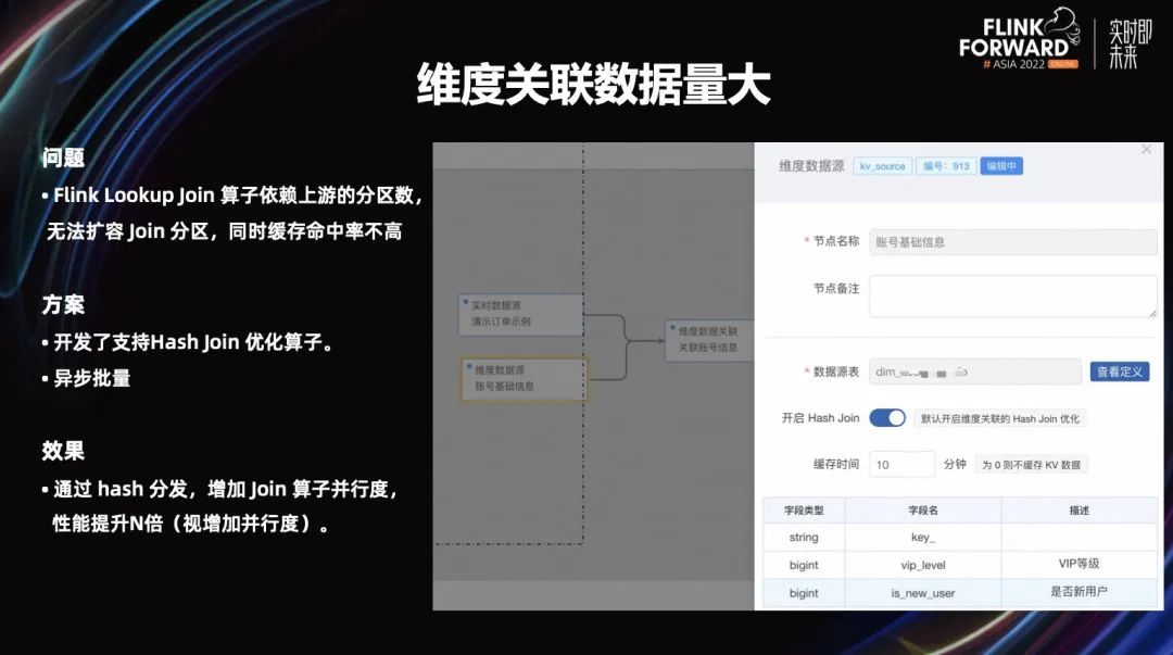 优化之后,因为是通过 hash 分发了,就可以扩容我们的 Flink 作业来提升它的吞吐能力,同时也提升了缓存的命中率,因为 hash 之后的缓存命中率会更高。对于用户来说,他只需在选择维表数据的时候开启 hash Join 策略即可,目前我们已默认打开了这种策略。
