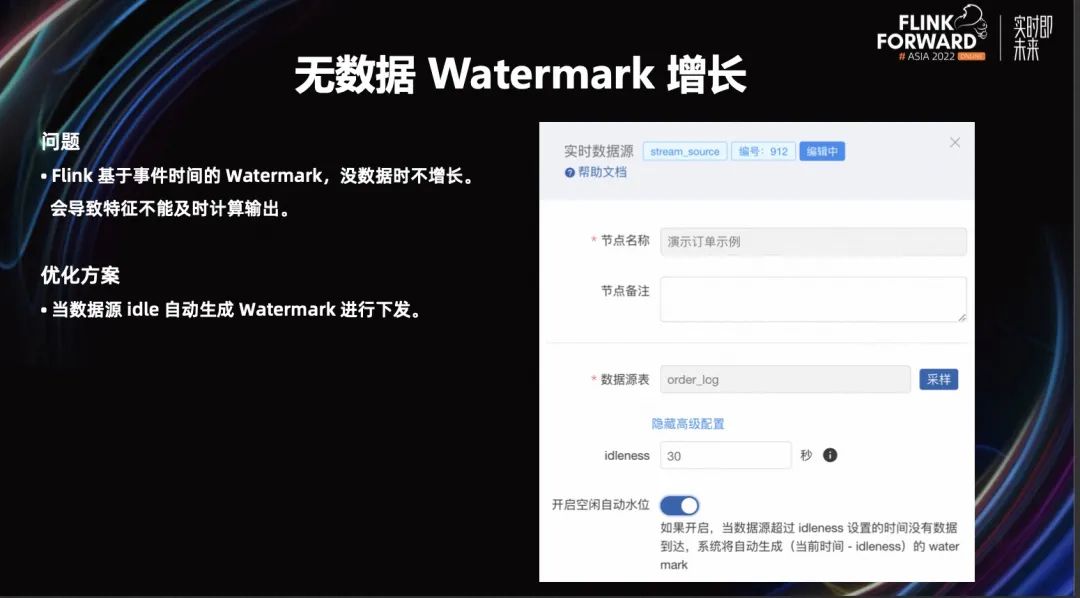 为此我们进行了一些优化,当数据源 idle 自动生成 Watermark 进行下发。即 idle 的时候,我们会生成一个系统层的 Watermark,Watermark 等于系统时间减去等待时间,然后 Watermark,推动整个工作流的 Watermark 增长。从而使得下游的窗口能够比较及时的输出。这样就算数据源不连续,我们也能得到实时特征。