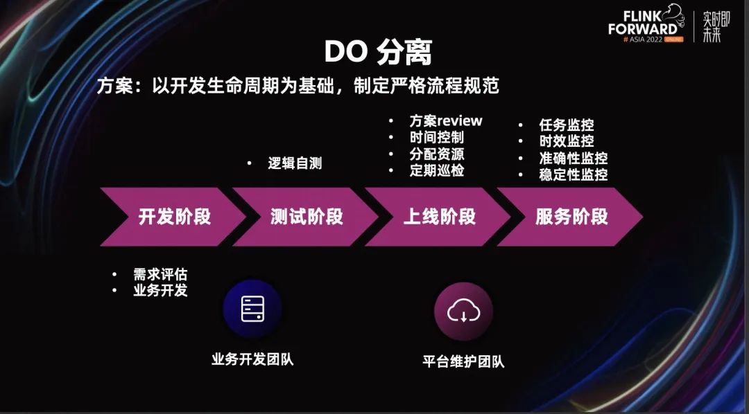 为什么这么做呢?因为我们的业务团队对 Flink 不熟悉,对 Flink 很多运营指标也不能很好的把控,比如 Watermark 的延迟监控、内存指标监控等等。而 Flink 团队他对 Flink 很熟悉,可以快速判断系统的瓶颈在哪里,优化调整资源等等。所以我们做了这样的职责分离,更好的保障我们服务的稳定性。