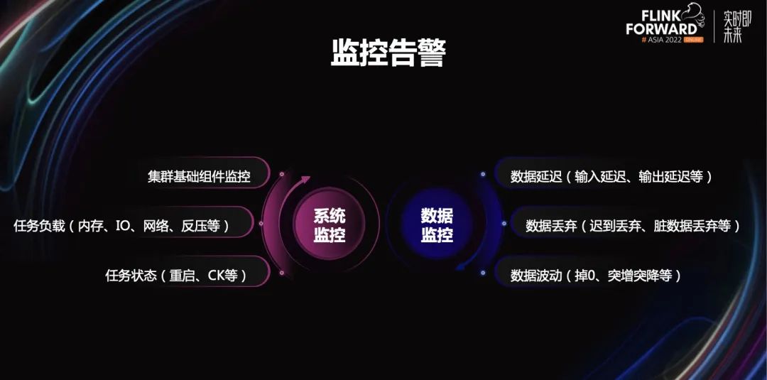 系统监控,它由我们的数据平台技术团队提供。它支持集群基础组件监控和负载监控,比如内存、IO、网络等等;支持任务状态,比如重启、CK 等等。 数据监控,数据还是要通过数据监控来才能更好的把握。比如数据延迟,输入延迟是多少,输出延迟是多少等等;数据丢弃,迟到丢弃多少,脏数据丢弃多少等等;数据波动,突增突降,突然掉 0 等等。