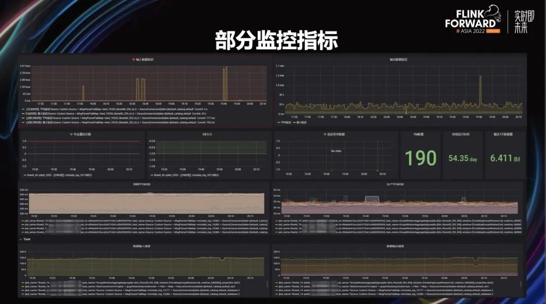 上图展示的是部分监控指标。包括数据输入延迟是多少、数据输出延迟是多少、每天处理计算量等等。