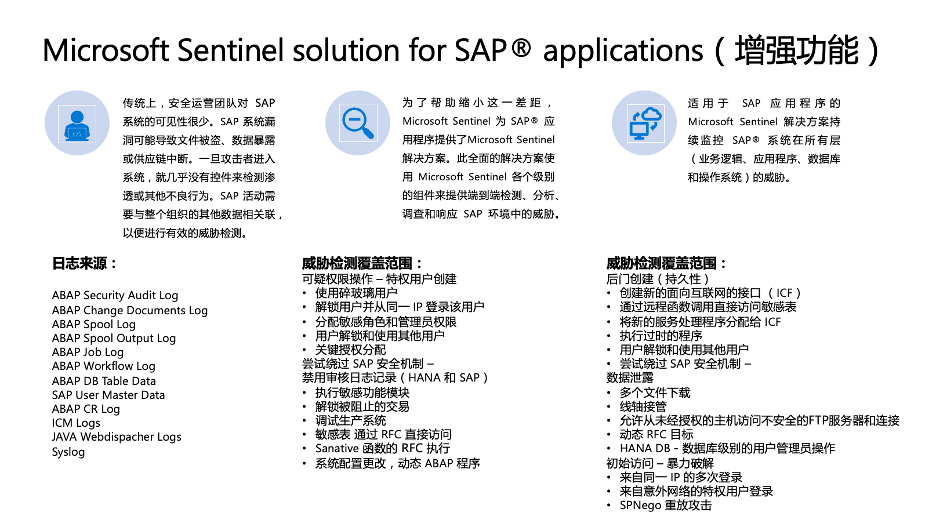 在今年的2023 SAP 全球蓝宝石大会上,微软扩展了对 SAP 商业应用程序的安全解决方案支持,引入了 Microsoft Sentinel 。Microsoft Sentinel 解决方案提供的外部警报和监控接口获得SAP S/4HANA、SAPS/4HANA Cloud 和 SAP ECC 的集成认证。