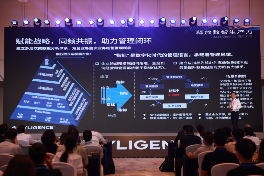 随后,Kyligence 应用方案总监张荣钢先生带来了 《让数据用起来,指标平台驱动业务增长创新》的主题演讲。随着数字化转型的深入,企业对数据平台的要求越来越高,既要秒查询,又要看得懂,还要快交付,更要高灵活。Kyligence 企业级指标平台产品及解决方案沉淀了 Kyligence 服务大型国有银行、头部股份制银行的经验,已经助力企业建立多层次的数据分析体系,为企业各层次业务经营管理赋能。