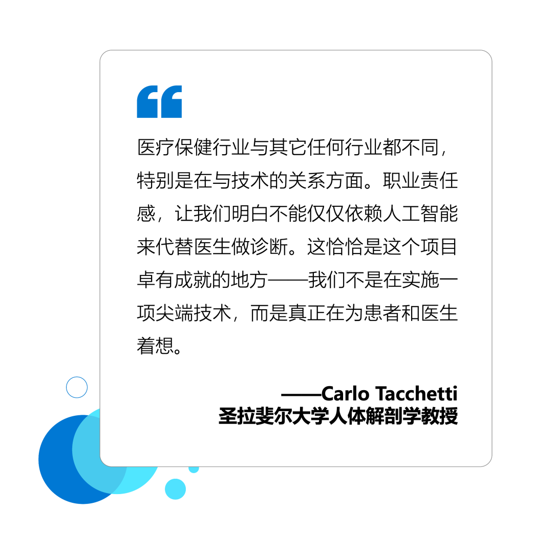 优化数据管理和分析之外,这也是一次圣拉斐尔大学和研究医院探索全新人工智能应用落地的机会。圣拉斐尔大学放射学教授 Antonio Esposito 解释说:“通过客观参数来预测患者需要哪种类型的医疗支持,这是我们与微软和 Porini 合作的原因,也是我们人工智能项目的诞生初心。”