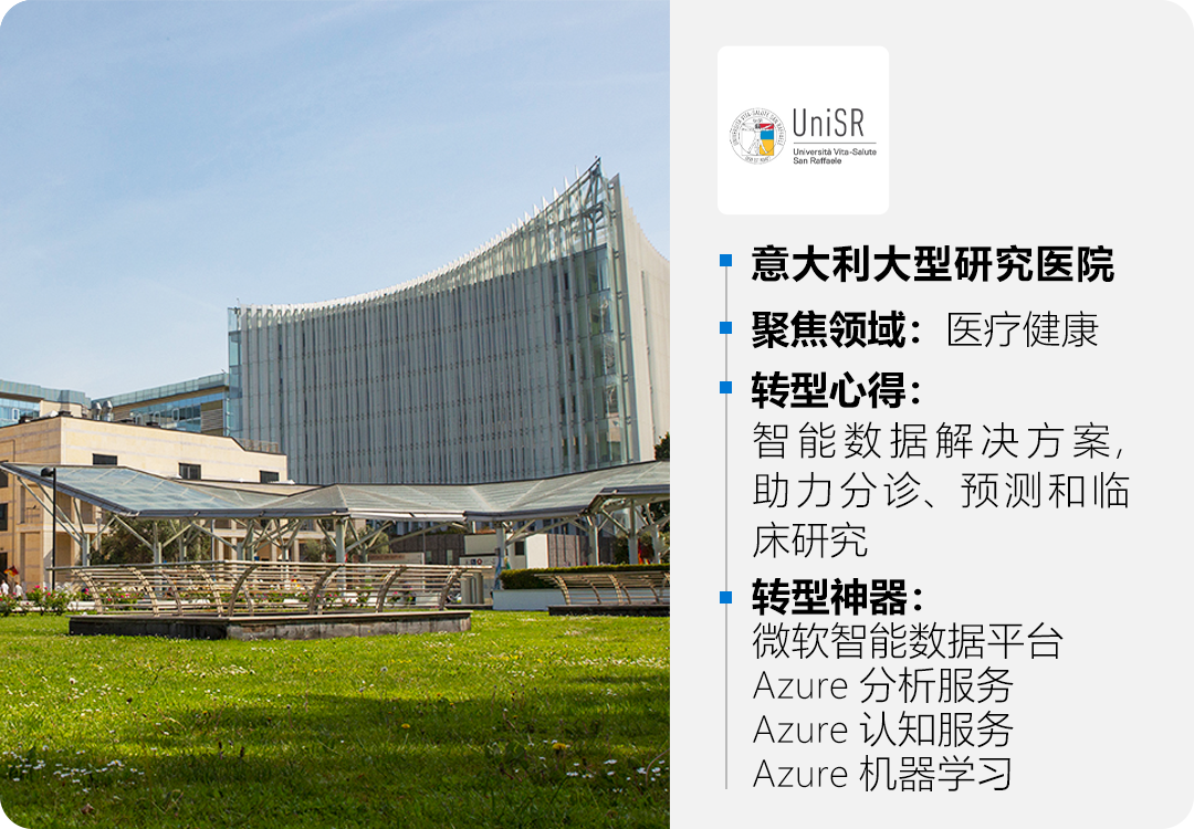 圣拉斐尔大学和研究医院是全球医疗领域数字和云解决方案实施的先驱,负责意大利研究型医院整体科研产出的15%。每年超过5万次的医疗服务和超过1100项正在进行的临床试验,让其成为培育医疗创新的沃土。基于前沿的数据和人工智能技术,圣拉斐尔医院与微软行业解决方案团队及合作伙伴 Porini 开发了一个用于数据分析和临床实验的尖端平台。