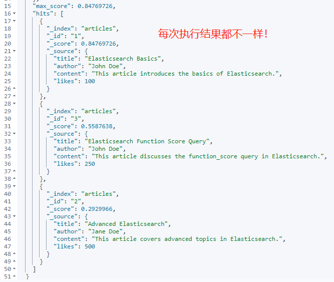 上述查询使用 Elasticsearch 的 function_score 查询,并配合使用 random_score 函数。random_score 函数根据 "likes" 字段的值生成一个随机分数。