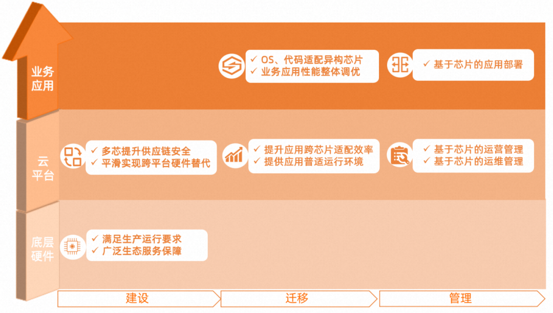 以企业完整的应用上云过程作为主线,以“一云多芯”路线作为预设课题,在云平台建设、应用迁移/上云、运维管理三个阶段,企业均有担忧和困扰: