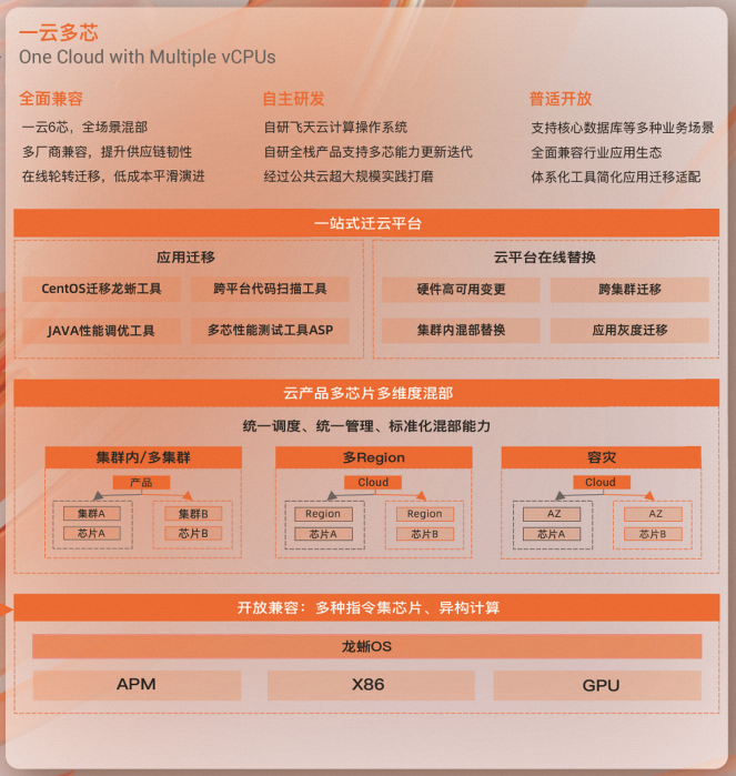 对用户来说,“一云多芯”的需求天然就存在,而云计算自诞生起就在不断追求体验一致的计算服务,通过云平台屏蔽底层架构差异,实现不同芯片架构计算资源的统一调度和管理,满足客户多方位的需求。