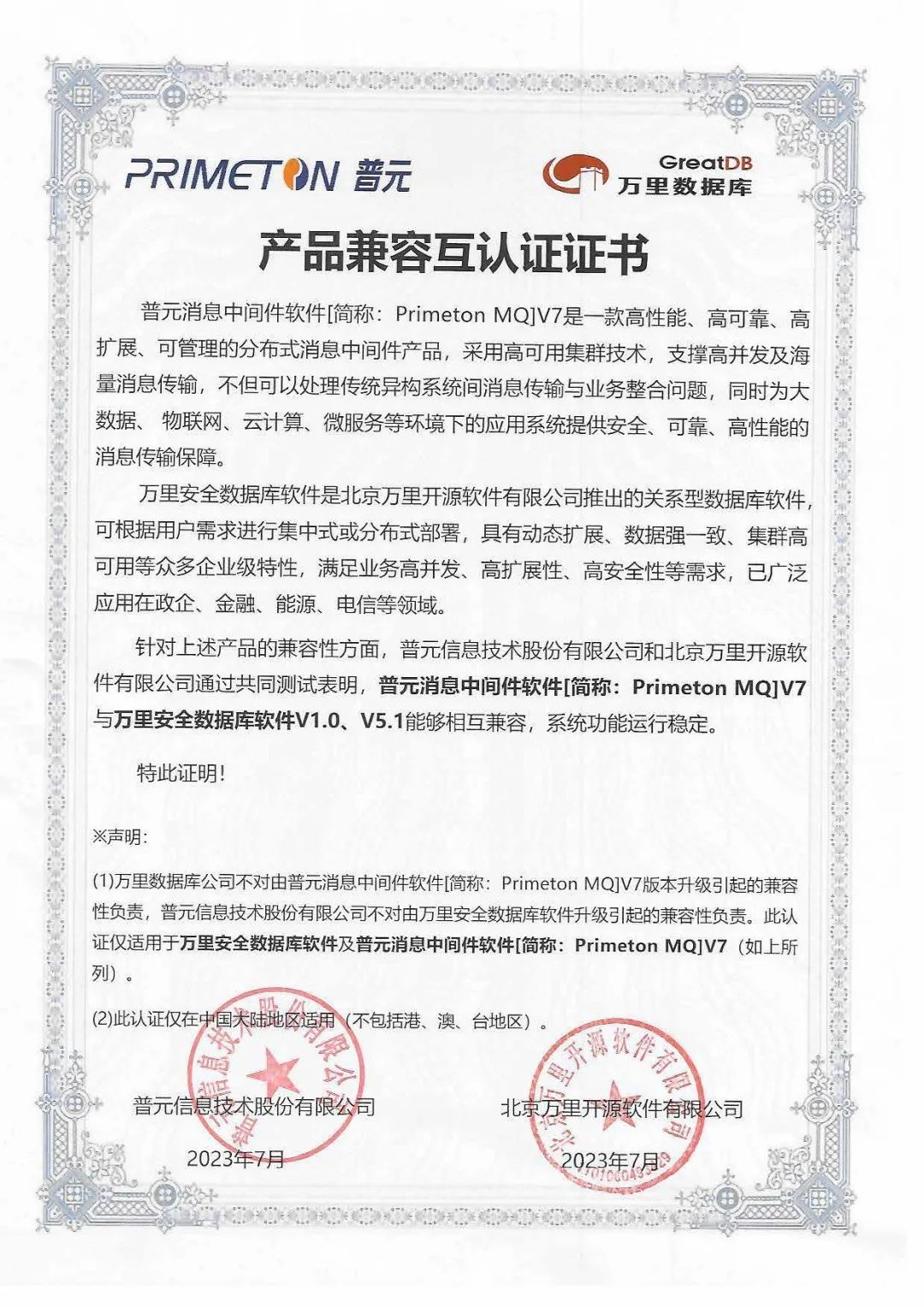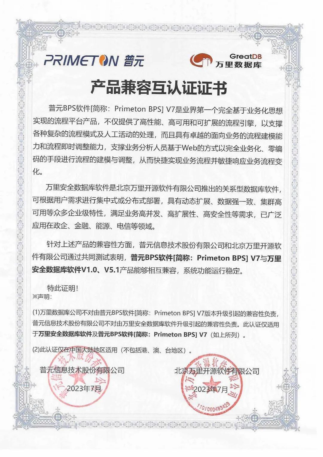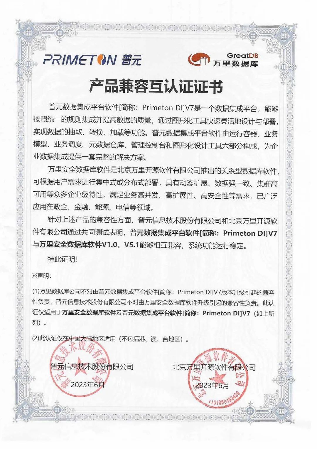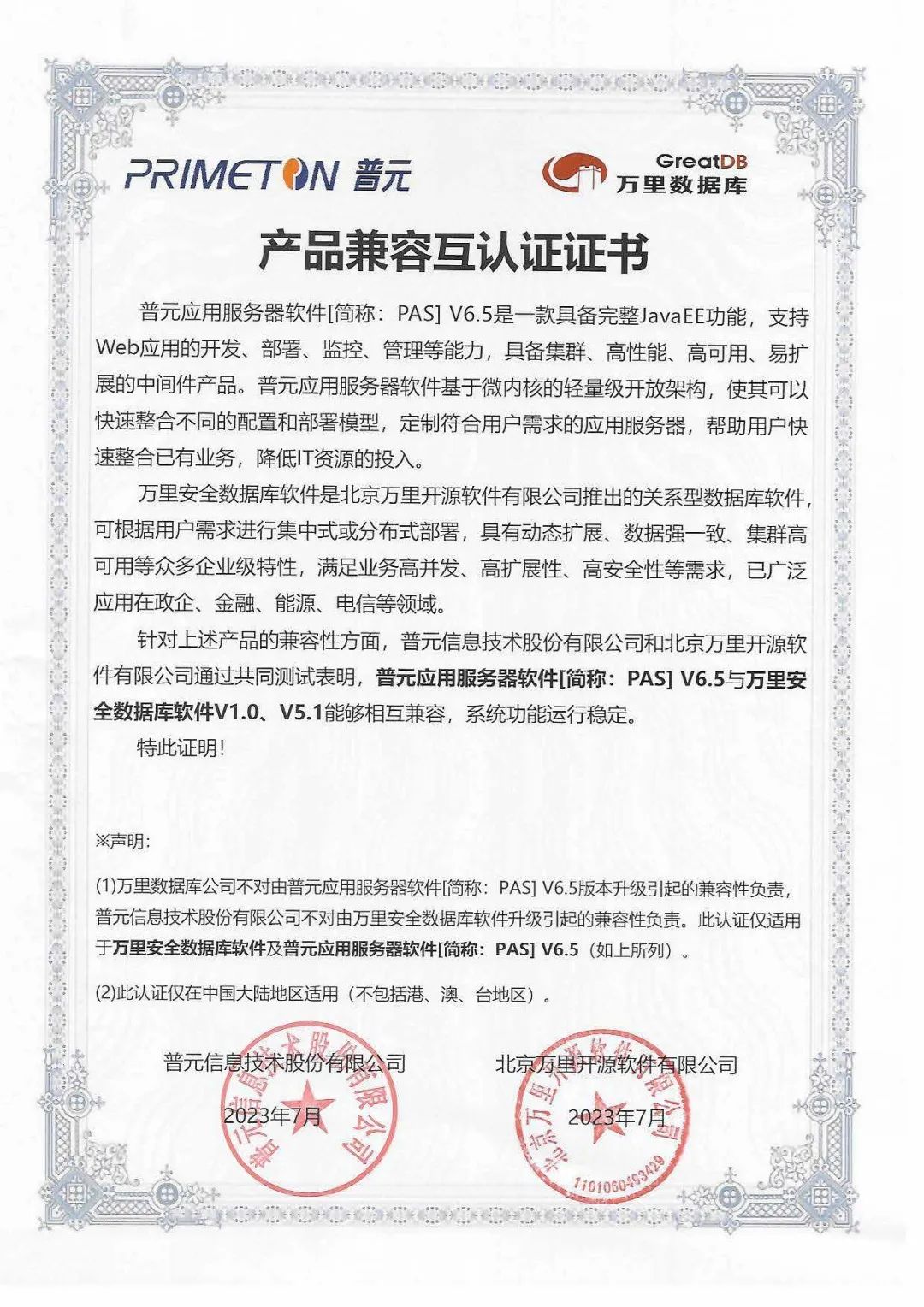 近日,北京万里开源软件有限公司(以下简称:万里数据库)与普元信息技术股份有限公司(以下简称:普元信息)完成了产品的兼容性互认证,万里安全数据库软件V1.0、V5.1与普元信息自主研发的8款信创中间件产品实现完美兼容。