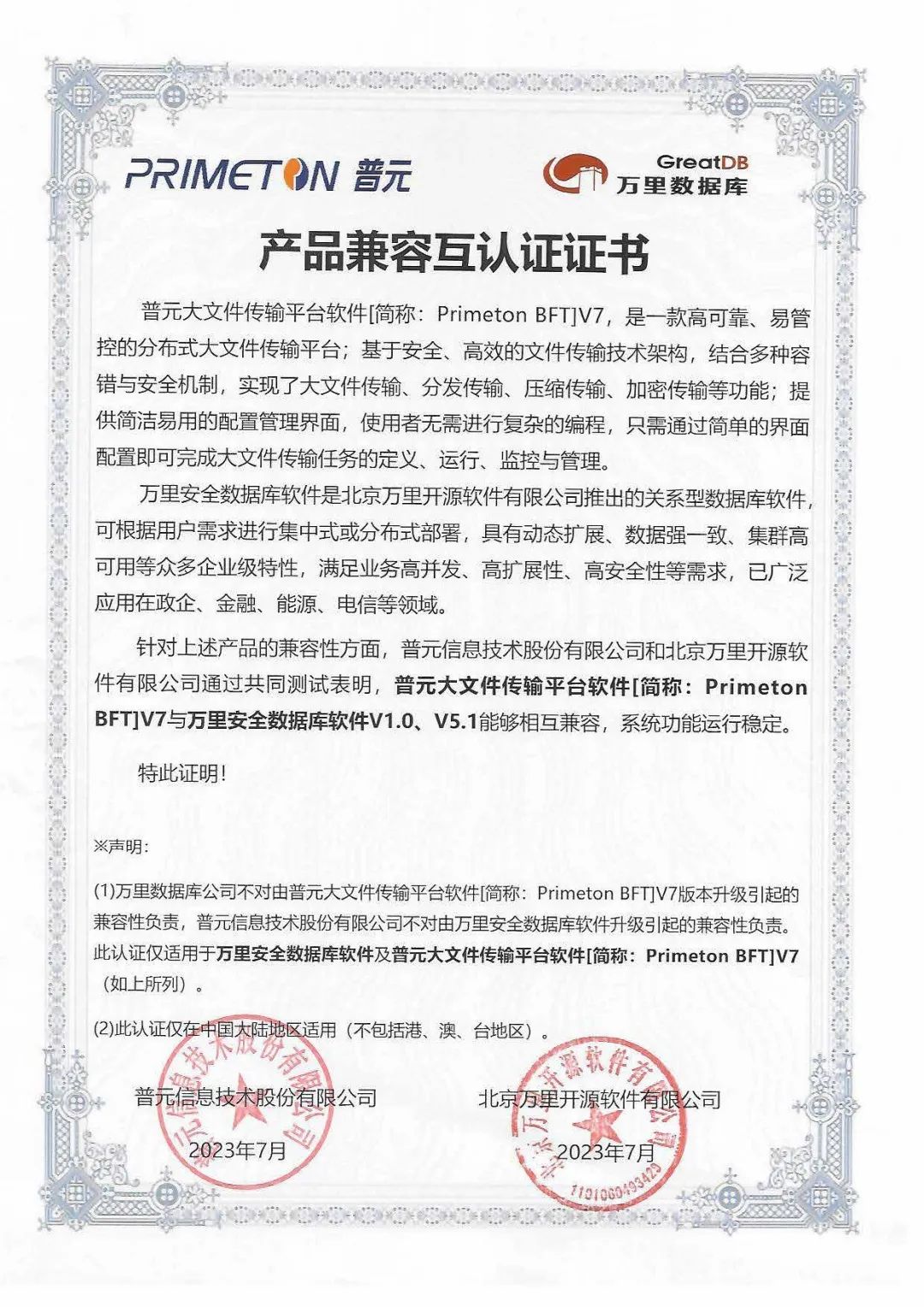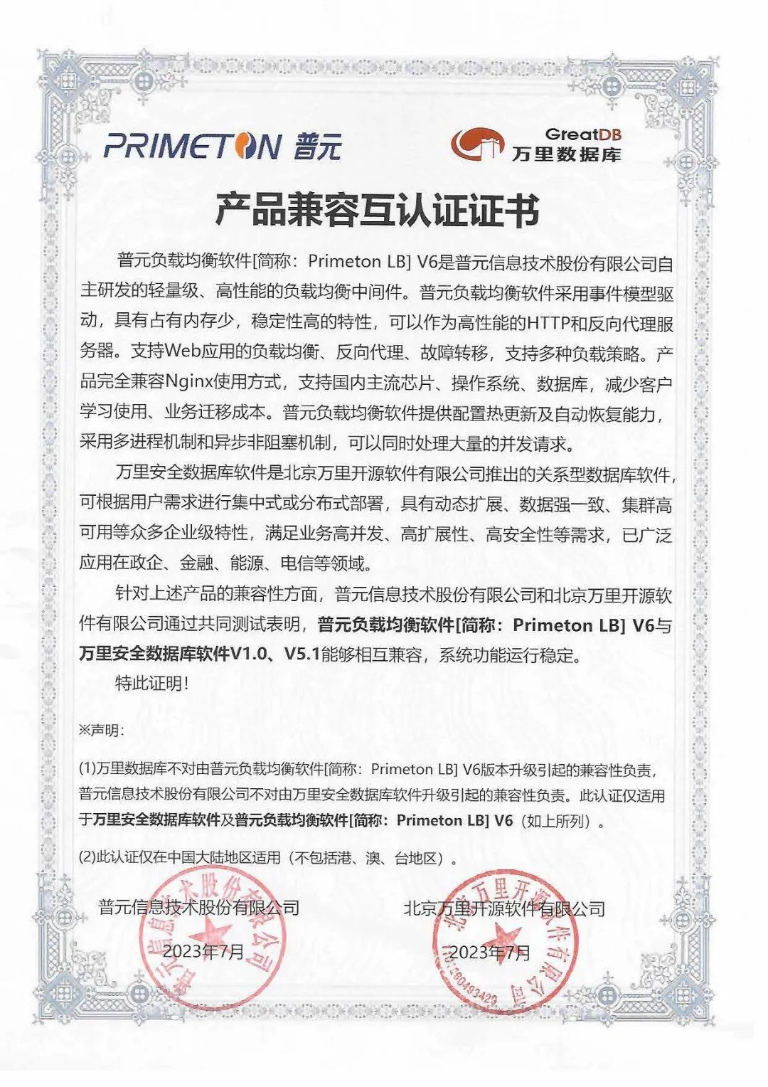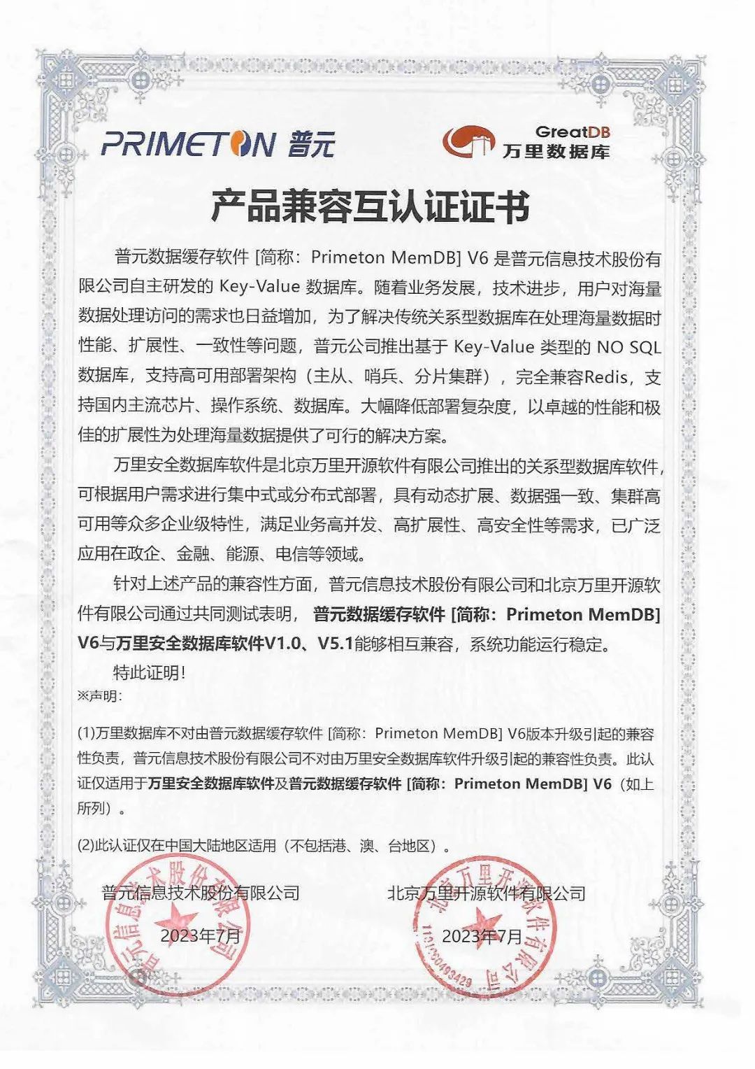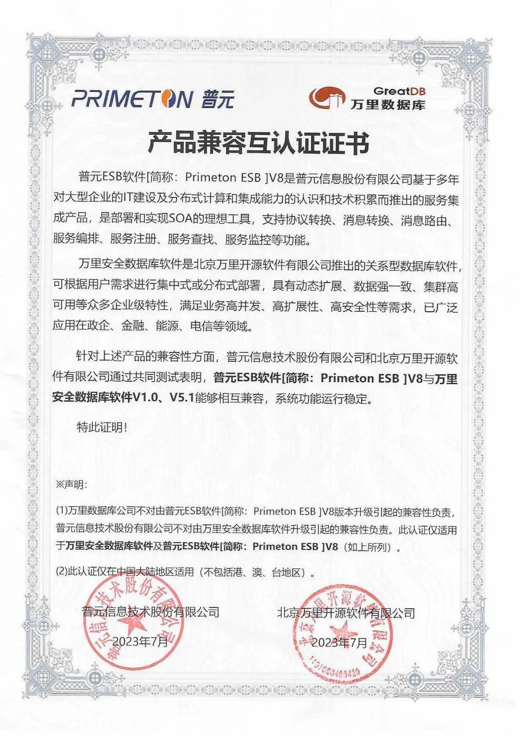 近日,北京万里开源软件有限公司(以下简称:万里数据库)与普元信息技术股份有限公司(以下简称:普元信息)完成了产品的兼容性互认证,万里安全数据库软件V1.0、V5.1与普元信息自主研发的8款信创中间件产品实现完美兼容。