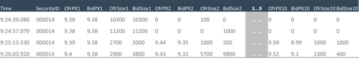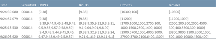 DolphinDB 支持数组(array)类型的列,在 array vector 中可以同时存10档数据。如上表所示,只需要 OfrPXs、BidPXs、OfrSizes 和 BidSizes 4列即可存储10档行情。数据压缩比可从4倍提高至10倍,间接提高了查询速度。另外,array vector 支持不定长存储,可以用于原始行情和因子存储。