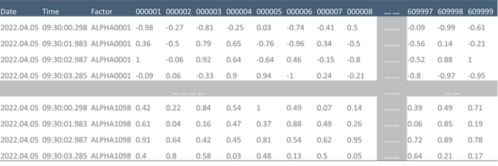 横截面计算在时序数据处理中极为常见,交易中经常需要存储多个标的甚至全部标的在同一横截面上的因子,并且需要对横截面进行面板数据分析。宽表存储天然适合面板数据,并能减少数据冗余,提高查询速度。