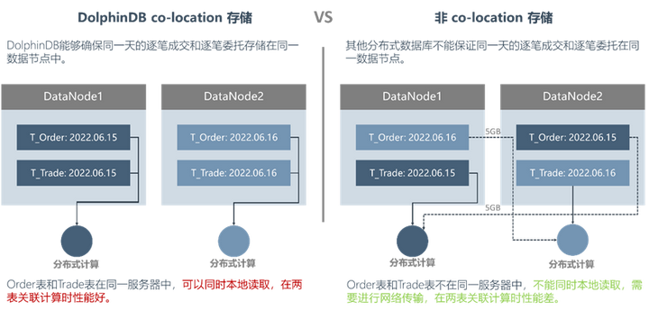 在量化交易中,需要关联逐笔委托和逐笔成交用于微观结构分析、因子生成和交易策略。DolphinDB 的 co-location 存储架构会强行将同一交易日的订单表和成交表存储在同一数据节点中,在关联计算时只需要读取同一节点数据,如上图左侧所示。这样的存储架构可以避免节点间的数据传输,大幅提高计算速度。