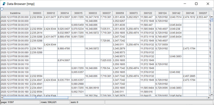 计算一只 ETF 的 IOPV,则需要把篮子中所有股票当前时刻的价值进行汇总,在这种场景下,可以使用 pivot by 生成矩阵(面板数据)。执行以下代码可以看到 pivot by 后的面板数据。