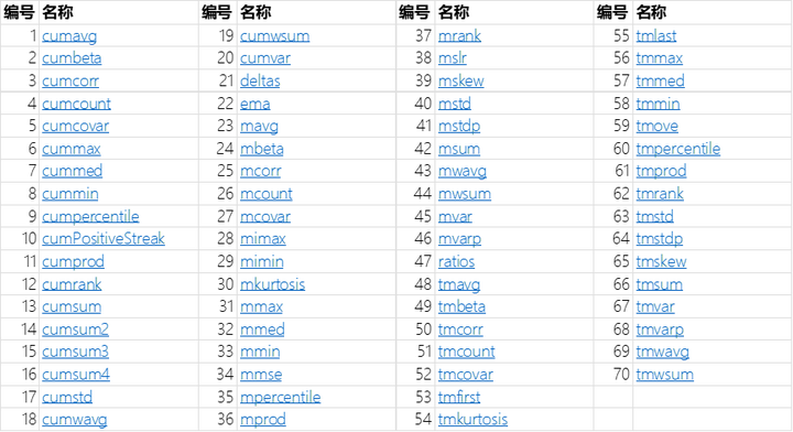 DolphinDB 支持数十种复杂的滑动、滚动和累计窗口计算函数。支持均值、最大、最小、中间值等较为简单的窗口计算;也支持最小二乘数估计、person 相关性、协方差、标准差、移动加权平均等较为复杂的函数。满足技术指标中的各类复杂计算。
