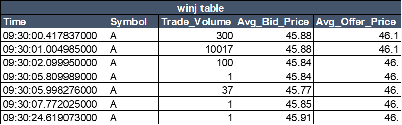 winjTable = select * from pwj(trades, orders, - 100000000:0, <[avg(Bid_Price) as Avg_Bid_Price, avg(Offer_Price) as Avg_Offer_Price]> ,`Symbol`Time)