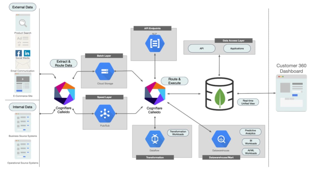 如果数据位于集中操作数据存储(如 MongoDB)中,那么可通过 Calleido 与分析数据存储(如 Google BigQuery)进行同步。借助Customer 360 数据库,内部相关方可将数据用于: