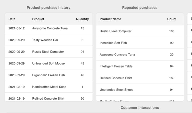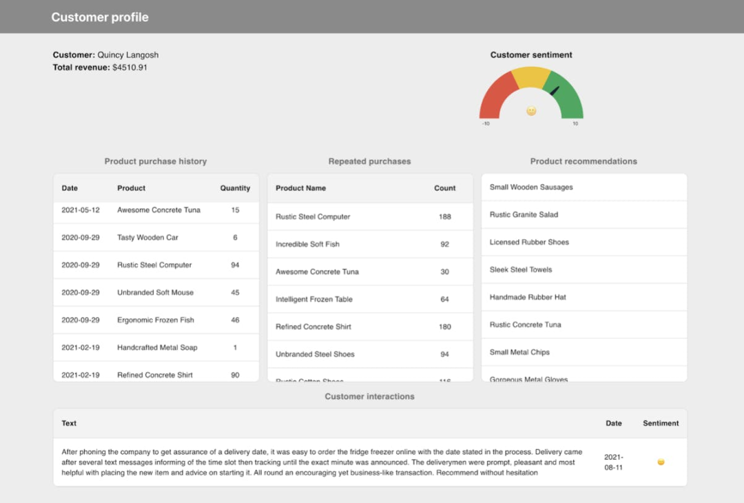 Customer 360 控制面板中的最终结果(本示例中所用的数据为自动生成):