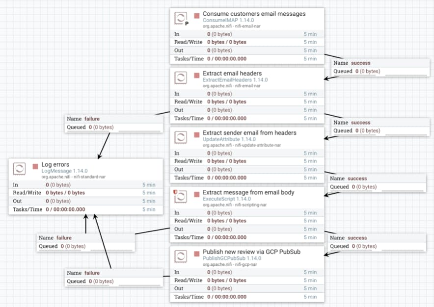 1. 自处理器从电子邮件服务器 (ConsumeIMAP) 提取 IMAP 消息起,工作流便开始了。进入所选收件箱(即客户服务)的每封新邮件都会触发一次事件。