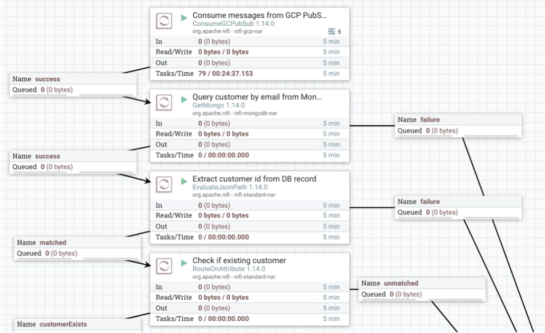 5. 接着,会用到前一工作流中的 GCP Pub/Sub 消息 (ConsumeGCPPubSub)。此时,我们会借助 MongoDB Atlas 的整合功能来验证MongoDB 数据库中的每一位发件人 (GetMongo)。如果某位客户已存在于我们的系统中,那么我们会把该电子邮件数据发送至下一工作流,然后忽略其他电子邮件。