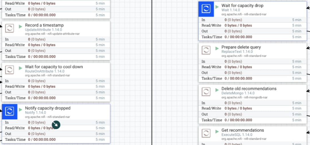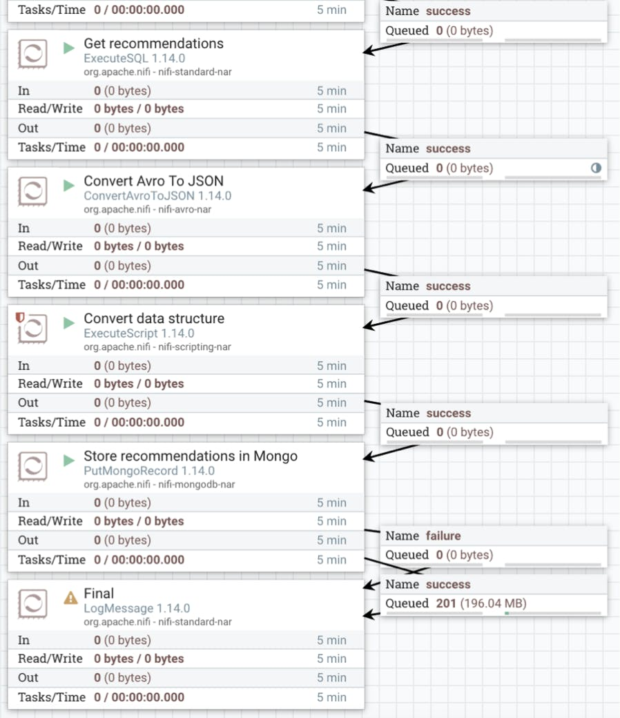 将推荐复制到 MongoDB 便完成了整个工作流。ExecuteSQL 处理器获取和集合每位用户的前 10 项推荐,均以 1,000 行的数据块呈现。接着,以下两个处理器(ConvertAvroToJSON 和 ExecuteScript)备好数据,通过 PutMongoRecord 处理器插入 MongoDB 集合。