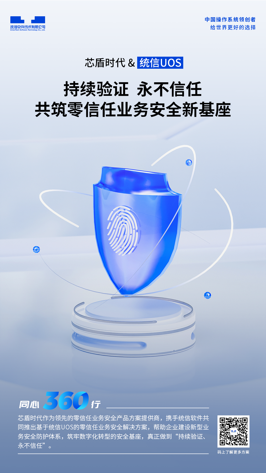芯盾时代作为领先的零信任业务安全产品方案提供商,携手统信软件,共同推出基于统信UOS的零信任业务安全解决方案,帮助企业建设新型业务安全防护体系,筑牢数字化转型的安全基座。