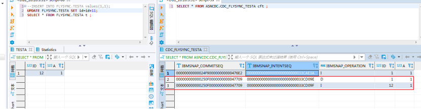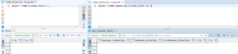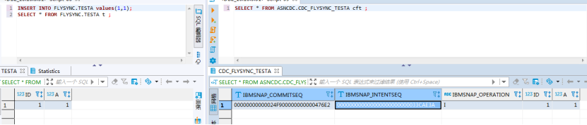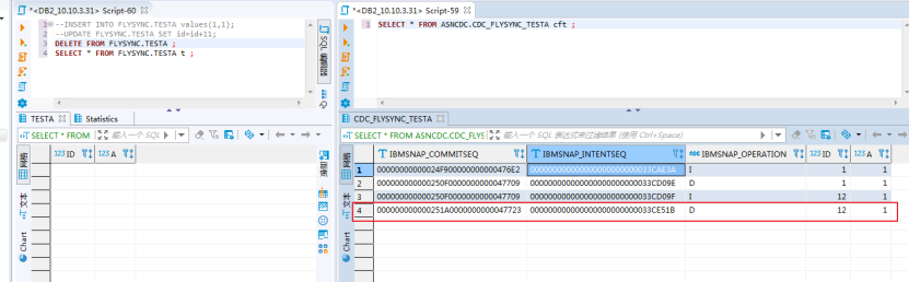 配置完成CDC后,DB2将会捕获相关的数据变更,可以通过插入/更新/删除相关表的数据来进行验证。假设create table flysync.testa(id int,a int)表已经完成CDC配置