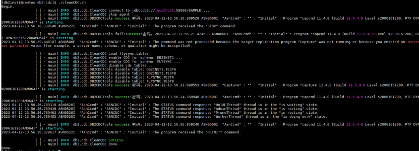 cleanCDC.sh | 清理db2 CDC的配置 | -h 查看使用说明 -c <path> :path表示setupCDC.conf的全路径,如果不指定-c参数,则默认使用当前路径下的 -a 使用此参数将清理db2所有CDC配置(包含安装的控制表和UDF jar),如果不指定此参数,则默认只清理flysync.tables里配置的CDC表 |
