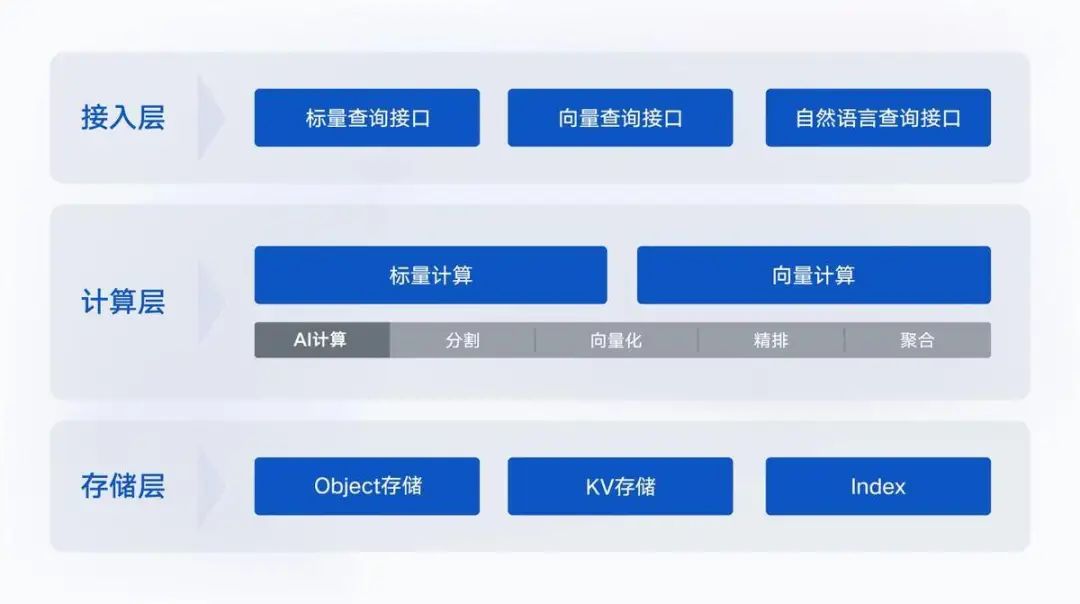 具体而言,在接入层,腾讯云向量数据库支持自然语言文本的输入,同时采用“标量+向量”的查询方式,支持全内存索引,最高支持每秒百万的查询量(QPS);在计算层,AI Native开发范式能实现全量数据AI计算,一站式解决企业在搭建私域知识库时的文本切分(segment)、向量化(embedding)等难题;在存储层,腾讯云向量数据库支持数据智能存储分布,助力企业存储成本降低50%。