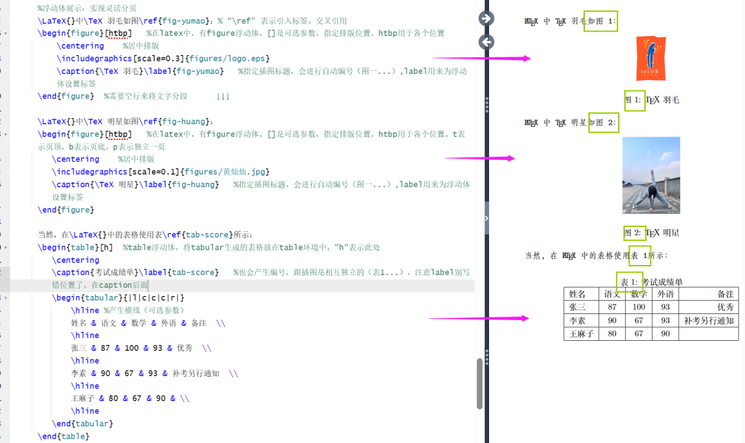 \begin{document}%浮动体展示:实现灵活分页\LaTeX{}中\TeX 羽毛如图\ref{fig-yumao}:% “\ref” 表示引入标签。交叉引用\begin{figure}[htbp] %在latex中,有figure浮动体。[]是可选参数,指定排版位置,htbp用于各个位置\centering %居中排版\includegraphics[scale=0.3]{figures/logo.eps}\caption{\TeX 羽毛}\label{fig-yumao} %指定插图标题,会进行自动编号(图一...),label用来为浮动体设置标签\end{figure} %需要空行来将文字分段 ↓↓↓\LaTeX{}中\TeX 明星如图\ref{fig-huang}:\begin{figure}[htbp] %在latex中,有figure浮动体。[]是可选参数,指定排版位置,htbp用于各个位置。t表示页顶,b表示页底,p表示独立一页\centering %居中排版\includegraphics[scale=0.1]{figures/黄灿灿.jpg}\caption{\TeX 明星}\label{fig-huang} %指定插图标题,会进行自动编号(图一...),label用来为浮动体设置标签\end{figure}当然,在\LaTeX{}中的表格使用表\ref{tab-score}所示:\begin{table}[h] %table浮动体,将tabular生成的表格放在table环境中。"h"表示此处\centering\caption{考试成绩单}\label{tab-score} %也会产生编号,跟插图是相互独立的(表1...),注意label别写错位置了,在caption后面\begin{tabular}{|l|c|c|c|r|}\hline %产生横线(可选参数)姓名 & 语文 & 数学 & 外语 & 备注 \\\hline张三 & 87 & 100 & 93 & 优秀 \\\hline李素 & 90 & 67 & 93 & 补考另行通知 \\\hline王麻子 & 80 & 67 & 90 & \\\hline\end{tabular}\end{table}\end{document}