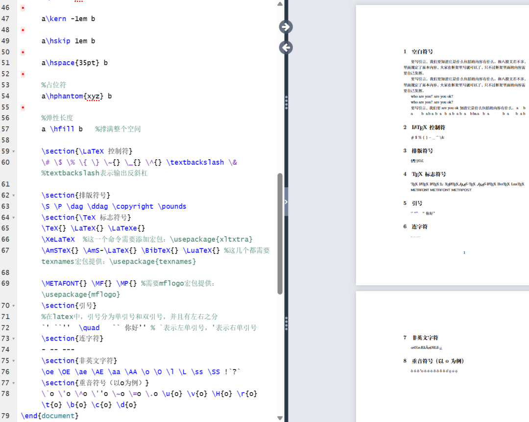 \begin{document}%特殊字符\section{空白符号} %就是说在你的文本中(无论中文还是英文),打一个空格和打多个空格都是一样的效果。%自动缩行要写引言,我们要知道它是什么包括 的内容有什么。和八股文差不多,里面规定了基本内容,大家在框架里写就可以了,只不过框架里面的内容需要自己发挥。%多个空格要写引言,我们要知道它是什么包括 的内容有什么。和八股文差不多,里面规定了基本内容,大家在框架里写就可以了,只不过框架里面的内容需要自己发挥。%一个空格who are you? are you ok? %一个空格who are you? are you ok? %多个空格要写引言,我们要are you ok知道它是什么包括的内容有什么。%如果在中文中插入英文,则会自动产生一个空格%那如何产生多个空格呢?用命令\quad%1em(当前字体中M的宽度)a \quad b%2ema \qquad b%约为1/6个ema\,b a \thinspace b%0.5个ema \enspace b%空格【反斜杠+空格】a\ b%硬空格(不能分割的空格)a~b%1pc = 12pt=4.218mma\kern 1pc b %产生指定宽度的空白a\kern -1em ba\hskip 1em ba\hspace{35pt} b%占位符a\hphantom{xyz} b%弹性长度a \hfill b %撑满整个空间\section{\LaTeX 控制符}\# \$ \% \{ \} \~{} \_{} \^{} \textbackslash \& %textbackslash表示输出反斜杠\section{排版符号}\S \P \dag \ddag \copyright \pounds\section{\TeX 标志符号}\TeX{} \LaTeX{} \LaTeXe{}\XeLaTeX %这一个命令需要添加宏包:\usepackage{xltxtra}\AmSTeX{} \AmS-\LaTeX{} \BibTeX{} \LuaTeX{} %这几个都需要texnames宏包提供:\usepackage{texnames}\METAFONT{} \MF{} \MP{} %需要mflogo宏包提供:\usepackage{mflogo}\section{引号}%在latex中,引号分为单引号和双引号,并且有左右之分`' ``'' \quad `` 你好'' % `表示左单引号,'表示右单引号\section{连字符}- -- ---\section{非英文字符}\oe \OE \ae \AE \aa \AA \o \O \l \L \ss \SS !`?`\section{重音符号(以o为例)}\`o \'o \^o \''o \~o \=o \.o \u{o} \v{o} \H{o} \r{o} \t{o} \b{o} \c{o} \d{o}\end{document}
