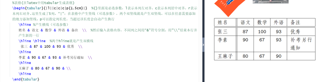 %表格(在latex中用tabular生成表格)\begin{tabular}{|l||c|c|c|p{1.5cm}|} %{}里面是必选参数:l表示本列左对齐,c表示本列居中对齐,r表示本列右对齐.这里生成了5列。“|”:在表格中产生竖线(可选参数),两个双竖线就是产生双竖线。可以在任意需要添加的地方添加竖线。p可以指定列长度,当超过该长度会自动产生换行\hline %产生横线(可选参数)姓名 & 语文 & 数学 & 外语 & 备注 \\ %然后输入表格内容,不同列之间用“&”符号分割。用"\\"结束本行并产生新的一行\hline \hline %两个hline就是产生双横线张三 & 87 & 100 & 93 & 优秀 \\\hline李素 & 90 & 67 & 93 & 补考另行通知 \\\hline王麻子 & 80 & 67 & 90 & \\\hline\end{tabular}