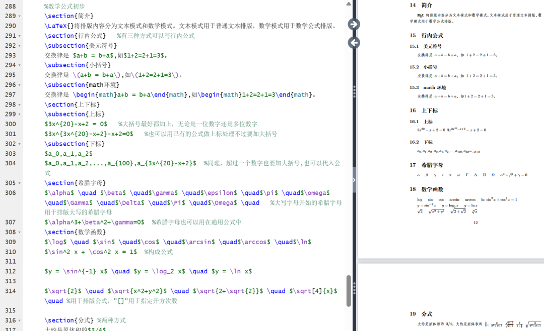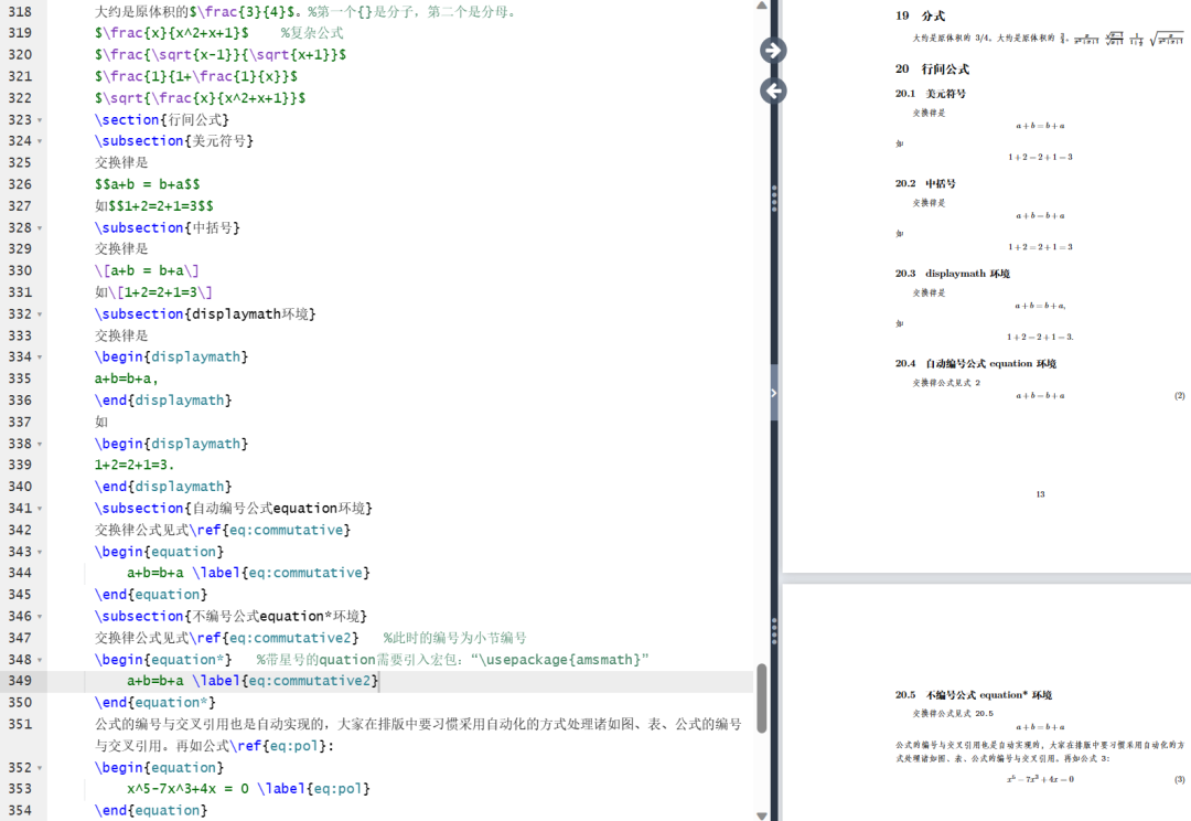\begin{document}%数学公式初步\section{简介}\LaTeX{}将排版内容分为文本模式和数学模式。文本模式用于普通文本排版,数学模式用于数学公式排版。\section{行内公式} %有三种方式可以写行内公式\subsection{美元符号}交换律是 $a+b = b+a$,如$1+2=2+1=3$。\subsection{小括号}交换律是 \(a+b = b+a\),如\(1+2=2+1=3\)。\subsection{math环境}交换律是 \begin{math}a+b = b+a\end{math},如\begin{math}1+2=2+1=3\end{math}。\section{上下标}\subsection{上标}$3x^{20}-x+2 = 0$ %大括号最好都加上,无论是一位数字还是多位数字$3x^{3x^{20}-x+2}-x+2=0$ %也可以用已有的公式做上标处理不过要加大括号\subsection{下标}$a_0,a_1,a_2$$a_0,a_1,a_2,...,a_{100},a_{3x^{20}-x+2}$ %同理,超过一个数字也要加大括号,也可以代入公式\section{希腊字母}$\alpha$ \quad $\beta$ \quad$\gamma$ \quad$\epsilon$ \quad$\pi$ \quad$\omega$ \quad$\Gamma$ \quad$\Delta$ \quad$\Pi$ \quad$\Omega$ \quad %大写字母开始的希腊字母用于排版大写的希腊字母$\alpha^3+\beta^2+\gamma=0$ %希腊字母也可以用在通用公式中\section{数学函数}$\log$ \quad $\sin$ \quad$\cos$ \quad$\arcsin$ \quad$\arccos$ \quad$\ln$$\sin^2 x + \cos^2 x = 1$ %构成公式$y = \sin^{-1} x$ \quad $y = \log_2 x$ \quad $y = \ln x$$\sqrt{2}$ \quad $\sqrt{x^2+y^2}$ \quad $\sqrt{2+\sqrt{2}}$ \quad $\sqrt[4]{x}$ \quad %用于排版公式,"[]"用于指定开方次数\section{分式} %两种方式大约是原体积的$3/4$。大约是原体积的$\frac{3}{4}$。%第一个{}是分子,第二个是分母。$\frac{x}{x^2+x+1}$ %复杂公式$\frac{\sqrt{x-1}}{\sqrt{x+1}}$$\frac{1}{1+\frac{1}{x}}$$\sqrt{\frac{x}{x^2+x+1}}$\section{行间公式}\subsection{美元符号}交换律是$$a+b = b+a$$如$$1+2=2+1=3$$\subsection{中括号}交换律是\[a+b = b+a\]如\[1+2=2+1=3\]\subsection{displaymath环境}交换律是\begin{displaymath}a+b=b+a,\end{displaymath}如\begin{displaymath}1+2=2+1=3.\end{displaymath}\subsection{自动编号公式equation环境}交换律公式见式\ref{eq:commutative}\begin{equation}a+b=b+a \label{eq:commutative}\end{equation}\subsection{不编号公式equation*环境}交换律公式见式\ref{eq:commutative2} %此时的编号为小节编号\begin{equation*} %带星号的quation需要引入宏包:“\usepackage{amsmath}”a+b=b+a \label{eq:commutative2}\end{equation*}公式的编号与交叉引用也是自动实现的,大家在排版中要习惯采用自动化的方式处理诸如图、表、公式的编号与交叉引用。再如公式\ref{eq:pol}:\begin{equation}x^5-7x^3+4x = 0 \label{eq:pol}\end{equation}\end{document}