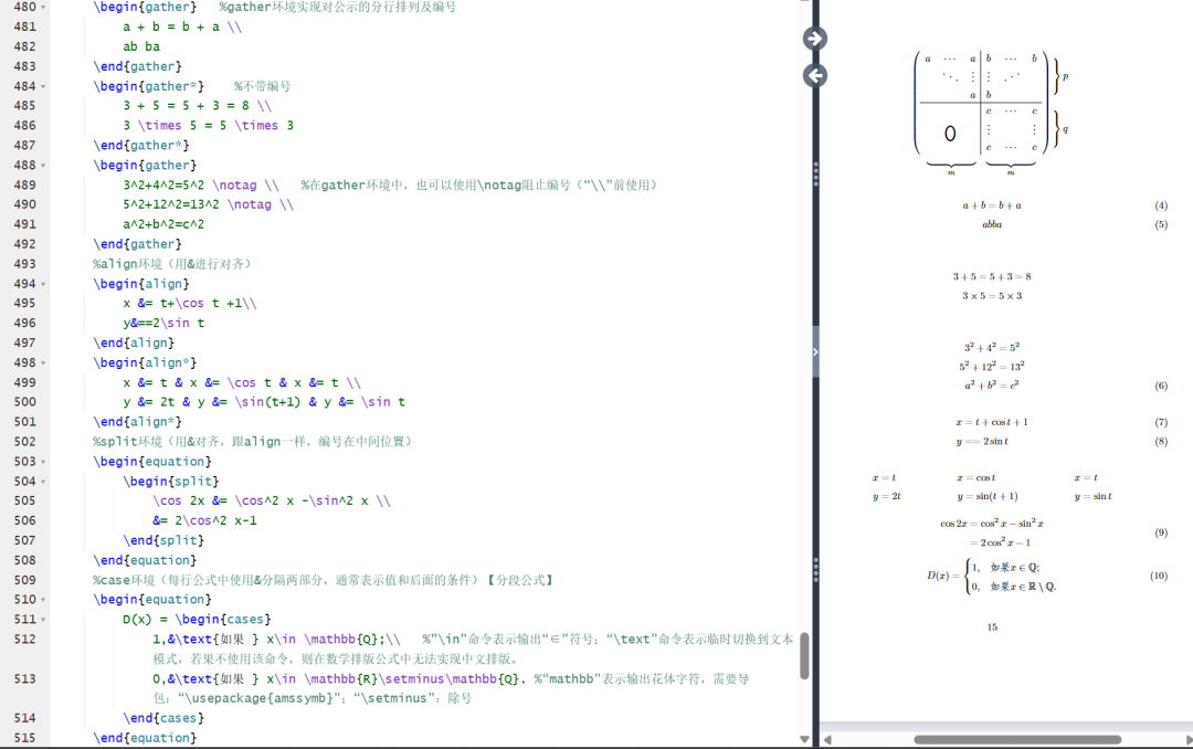 \begin{document}%多行公式%gather环境\begin{gather} %实现对公示的分行排列及编号a + b = b + a \\ab ba\end{gather}\begin{gather*} %不带编号3 + 5 = 5 + 3 = 8 \\3 \times 5 = 5 \times 3\end{gather*}\begin{gather}3^2+4^2=5^2 \notag \\ %在gather环境中,也可以使用\notag阻止编号(“\\”前使用)5^2+12^2=13^2 \notag \\a^2+b^2=c^2\end{gather}%align环境(用&进行对齐)\begin{align}x &= t+\cos t +1\\y&==2\sin t\end{align}\begin{align*}x &= t & x &= \cos t & x &= t \\y &= 2t & y &= \sin(t+1) & y &= \sin t\end{align*}%split环境(用&对齐,跟align一样,编号在中间位置)\begin{equation}\begin{split}\cos 2x &= \cos^2 x -\sin^2 x \\&= 2\cos^2 x-1\end{split}\end{equation}%case环境(每行公式中使用&分隔两部分,通常表示值和后面的条件)【分段公式】\begin{equation}D(x) = \begin{cases}1,&\text{如果 } x\in \mathbb{Q};\\ %"\in"命令表示输出“∈”符号;“\text”命令表示临时切换到文本模式,若果不使用该命令,则在数学排版公式中无法实现中文排版。0,&\text{如果 } x\in \mathbb{R}\setminus\mathbb{Q}. %“mathbb”表示输出花体字符,需要导包:“\usepackage{amssymb}”;“\setminus”:除号\end{cases}\end{equation}\end{document}