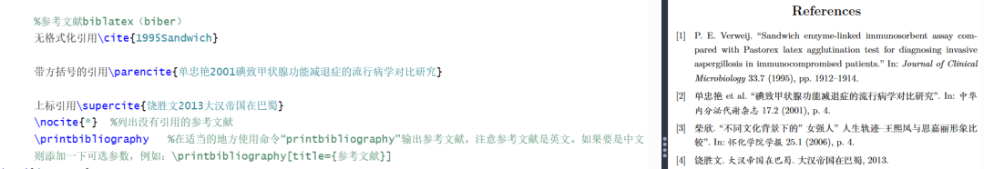 \begin{document}%参考文献biblatex(biber)无格式化引用\cite{1995Sandwich}带方括号的引用\parencite{单忠艳2001碘致甲状腺功能减退症的流行病学对比研究}上标引用\supercite{饶胜文2013大汉帝国在巴蜀}\nocite{*} %列出没有引用的参考文献\printbibliography %在适当的地方使用命令“printbibliography”输出参考文献,注意参考文献是英文。如果要是中文则添加一下可选参数,例如:\printbibliography[title={参考文献}]\end{document}