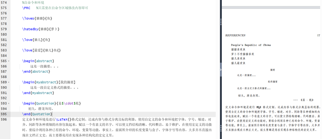 \begin{document}%自命令和环境\PRC %只需要在自命令区域修改内容即可\loves{猫猫}{鱼}\hatedby{猫猫}{萝卜}\love{猫儿}{鱼}\love[最爱]{猫儿}鱼{}\begin{abstract}这是一段摘要。。。\end{abstract}\begin{myabstract}[我的摘要]这是一段自定义格式的摘要。。。\end{myabstract}\begin{Quotation}{易$\cdot$乾}初九,潜龙勿用。\end{Quotation}定义命令和环境是进行\LaTeX{}格式定制、达成内容与格式分离且标的利器。使用自定义的命令和环境把字体、字号、缩进、对齐、间距等各种琐细的内容包装起来,赋以一个有意义的名字,可以使文挡结构清晰、代码整洁、易于维护。在使用宏定义的功能时,要综合利用各种已有的命今、环境、变量等功能,事实上,前面所介绍的长度变量与盒子、字体字号等内容,大多并丕直接出现在文档正文史,而主要都是用在实现各种结构化的宏定义里。