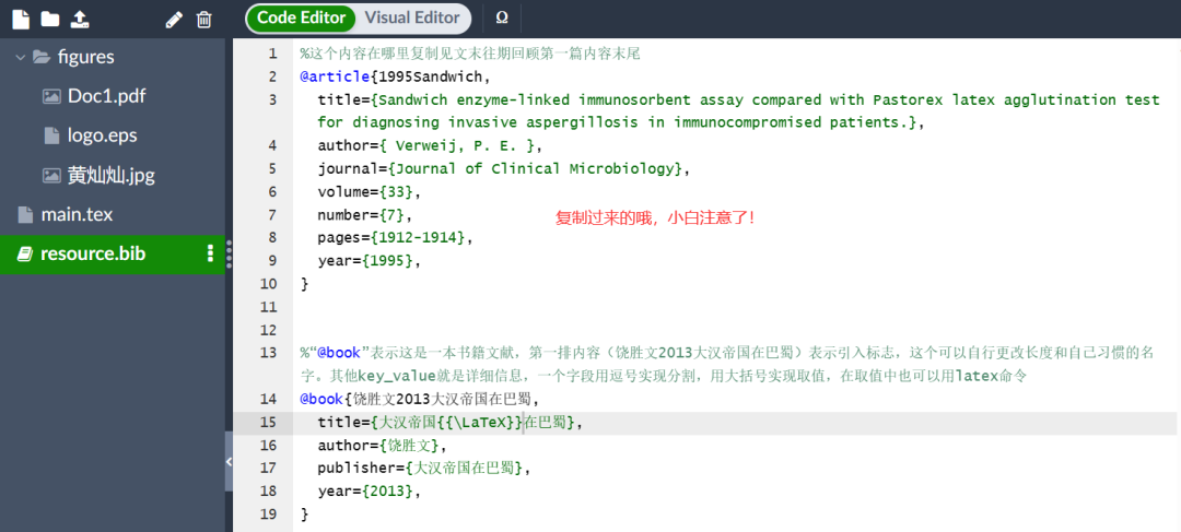 然后打开这个文件将内容复制进去(如何找如下图的内容见文章LaTex4【下载模板、引入文献】):