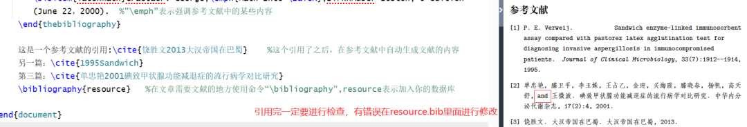 这是一个参考文献的引用:\cite{饶胜文2013大汉帝国在巴蜀} %这个引用了之后,在参考文献中自动生成文献的内容另一篇:\cite{1995Sandwich}第三篇:\cite{单忠艳2001碘致甲状腺功能减退症的流行病学对比研究}\bibliography{resource} %在文章需要文献的地方使用命令“\bibliography”,resource表示加入你的数据库