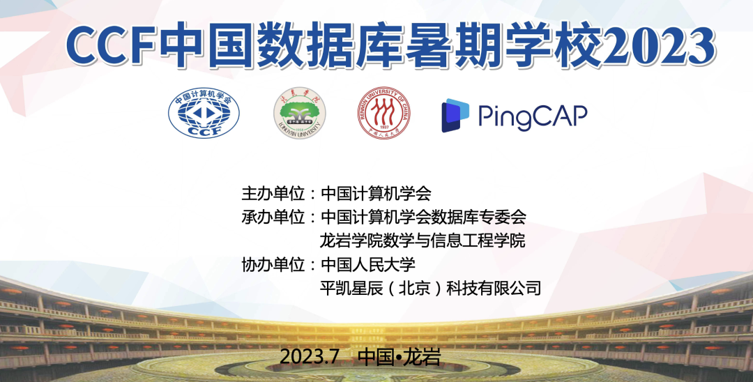 由中国计算机学会(CCF)主办、数据库专业委员会和龙岩学院数学与信息工程学院联合承办、中国人民大学和平凯星辰(北京)科技有限公司协办的 2023 年度(第 22 届)中国数据库学院暑期学校于 2023 年 7 月 21 日 - 2023 年 7 月 26 日在福建省龙岩市成功举办。
