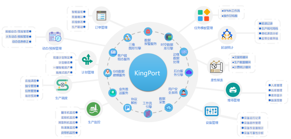 通过KingPort智慧港口柔性管控平台,可展示港务公司开展的集工业大数据、智能排产、计划调度、运营监视、自动执行、统计分析、人工智能模型和系统柔性配置于一体的下一代智慧散料港口抽象模型和工程示范,助力港务公司引领行业发展、打造世界领先的智慧港口的决心和实力。