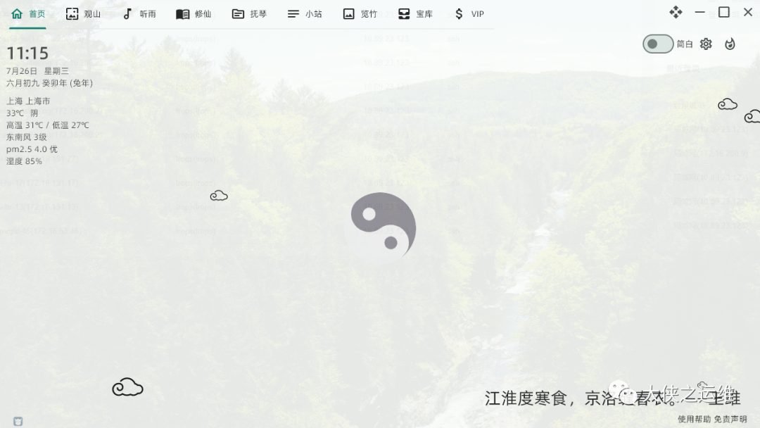 主页很简洁,左边有时间、天气等,右下有诗,陶冶情操 中间大大的太极logo,戒骄戒躁