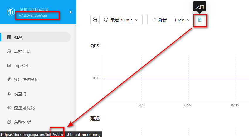 为了验证编译效果,本例中对 TiDB Dashboard 做了小小改动,版本号增加了 -ShawnYan 后缀,在【概况】、【监控指标】页面有文档链接,实际产品中指向了 stable 版本,这里修改为 v7.2。