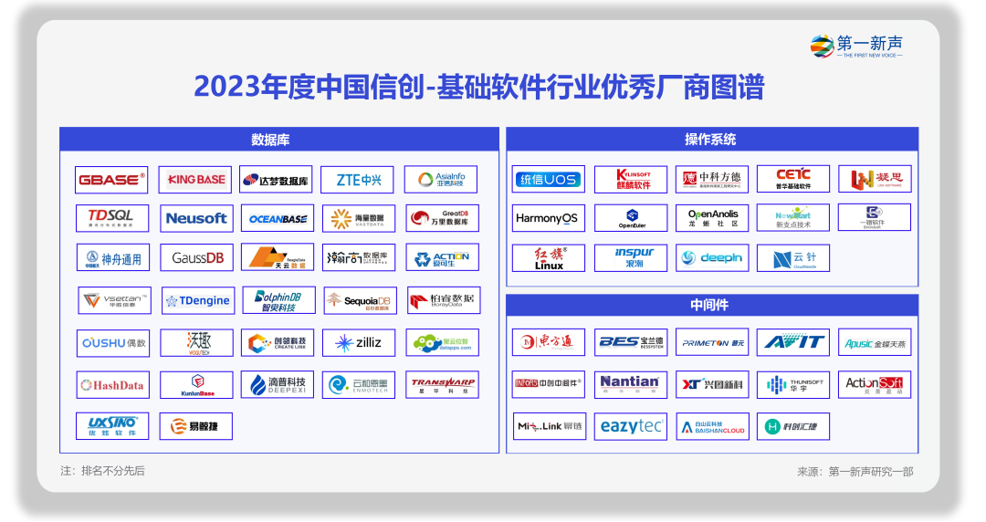 本图谱由第一新声基于市场公开数据,并通过调研问卷、电话访谈、记者采访等多种方式,收集企业数据信息;同时邀请甲方企业CXO高管、产业专家、一线投资机构合伙人等专家担任专家顾问,筛选出受资本市场关注、受客户认可的高科技、高成长、好口碑、稳交付、跨周期的基础软件优秀厂商。
