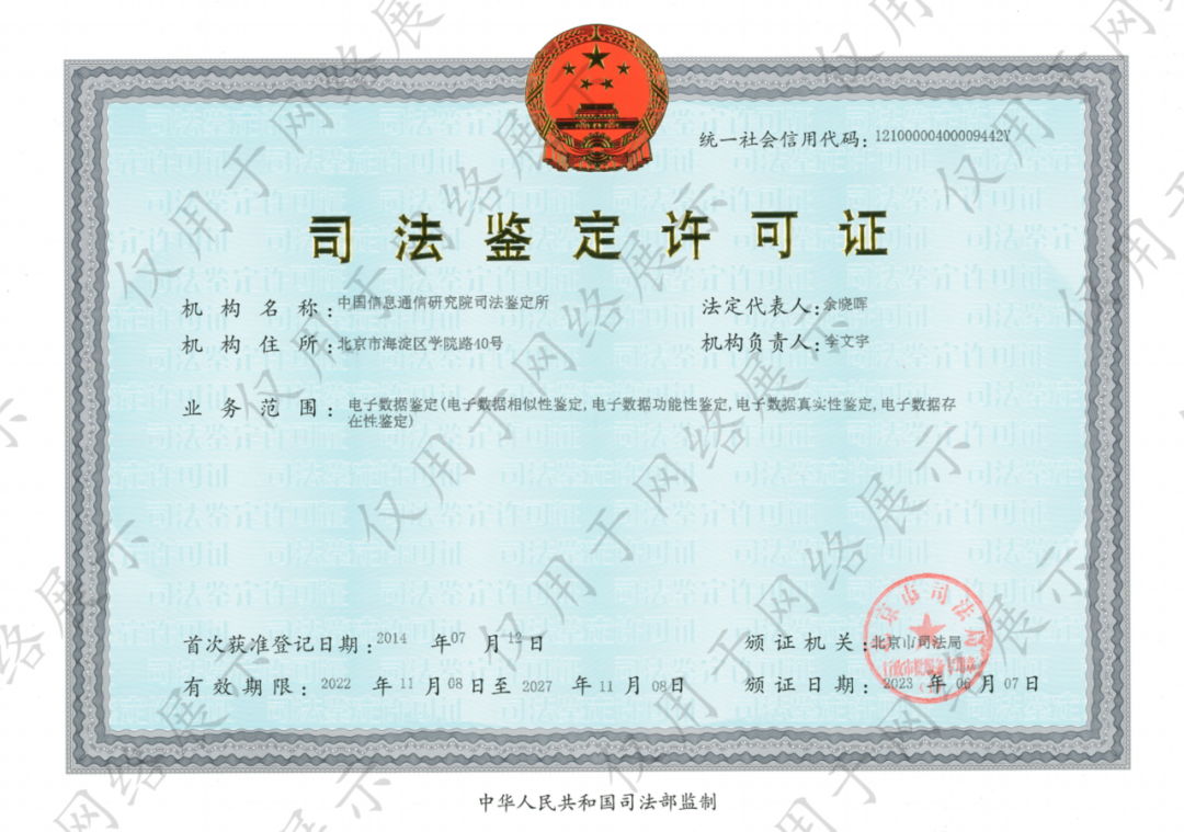 中国信通院司法鉴定所于2014年7月获得行政许可,隶属于中国信通院。司法鉴定所配备有电子数据司法鉴定实验室,可进行包括功能性鉴定、真实性鉴定、存在性鉴定和相似性鉴定的电子数据鉴定。实验室于2020年获得中国合格评定认可委员会CNAS认可,于2022年获得中国国家认证认可管理委员会CMA资质认定。
