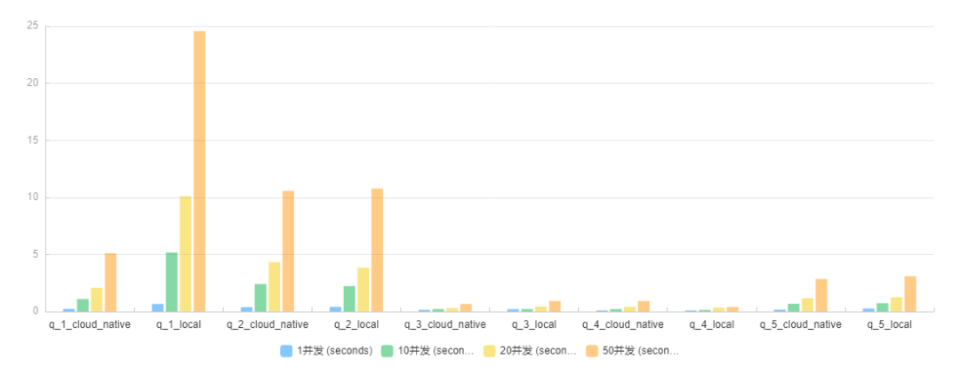 “从下面的对比图可以看出,q2 - q5 四个 sql,local 表与 cloud native 表的查询性能基本持平,q1 在 10 并发以上的场景下 cloud native 表都比 local 表查询性能要好”。