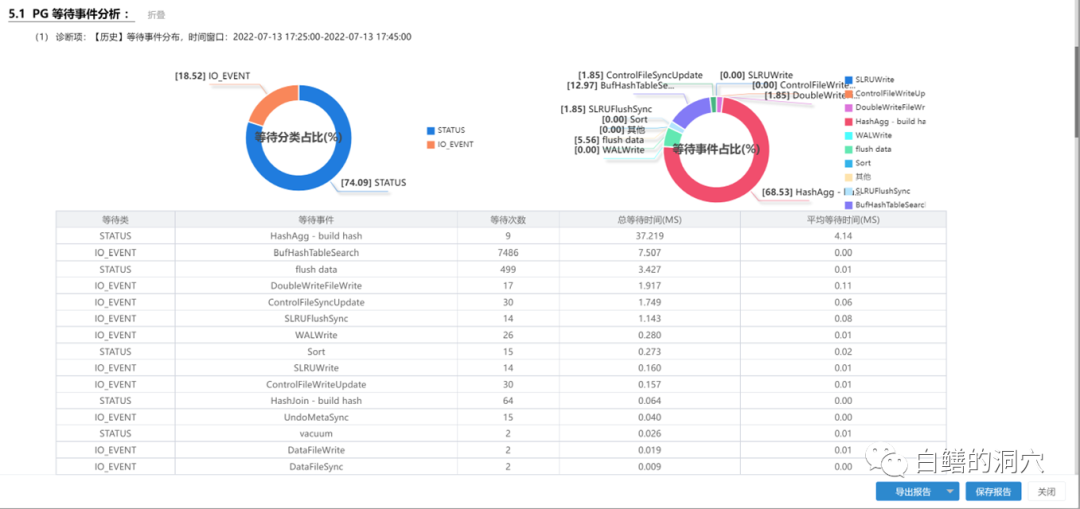 IO | StrategyGetBuffer | 表示后台进程正在等待从缓冲区管理器中获取一个可用的缓冲区页面。缓冲区管理器使用Clock Sweep算法来选择一个候选的缓冲区页面,如果该页面是干净的,或者可以被写回磁盘,那么就可以分配给后台进程。如果该页面是脏的,或者被其他进程锁定或引用,那么就需要继续扫描下一个页面。当缓冲区中的页面都很繁忙时,就会出现StrategyGetBuffer等待事件 | 缓冲区配置、热块冲突、并发过大、检查点不合理 |