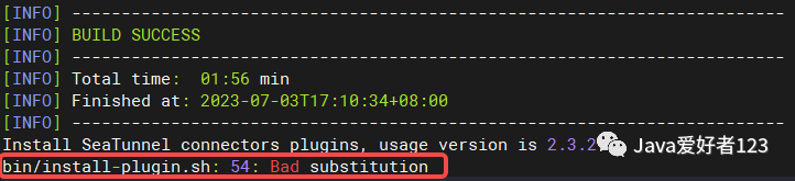 镜像,不然容易失败或者慢官方文档写着执行 sh bin/install-plugin.sh,我在 Ubuntu 20.04.2 LTS 上执行报错(bin/install-plugin.sh: 54: Bad substitution),我提了PR(https://github.com/apache/seatunnel-website/pull/253)。